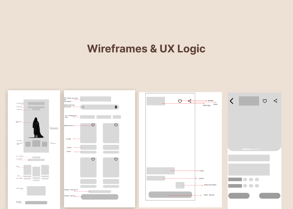 Lo-fi wireframes focused on mobile "thumb-friendly" grid layouts. Testing validated that users preferred a high-quality "Brand Story" approach.